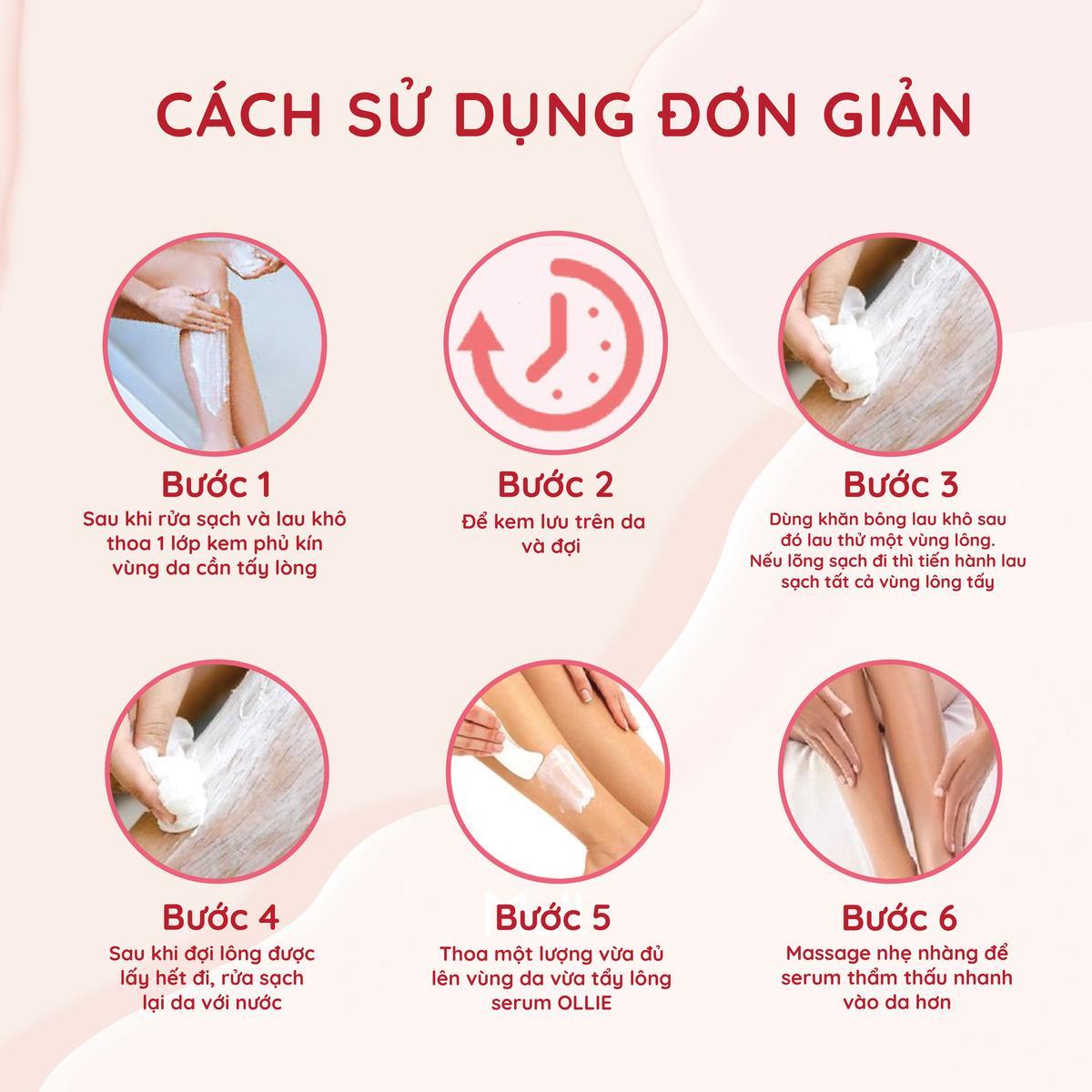 - Cách sử dụng: + Bước 1: Thoa một lớp kem phủ kín vùng da cần tẩy lông + Bước 2: Để kem lưu trên da và đợi + Bước 3: Lau khô thử một vùng lông, sau đó tiến hành lau sạch rất cả vùng kem tẩy + Bước 4: Sau khi đợi lông được lấy sạch hết đi, rửa sạch lại với nước + Bước 5: Thoa một lượng vừa đủ serum OLLIE lên vùng da vừa tẩy lông + Bước 6: Massage nhẹ nhàng để serum dễ thẩm thấu vào da hơn